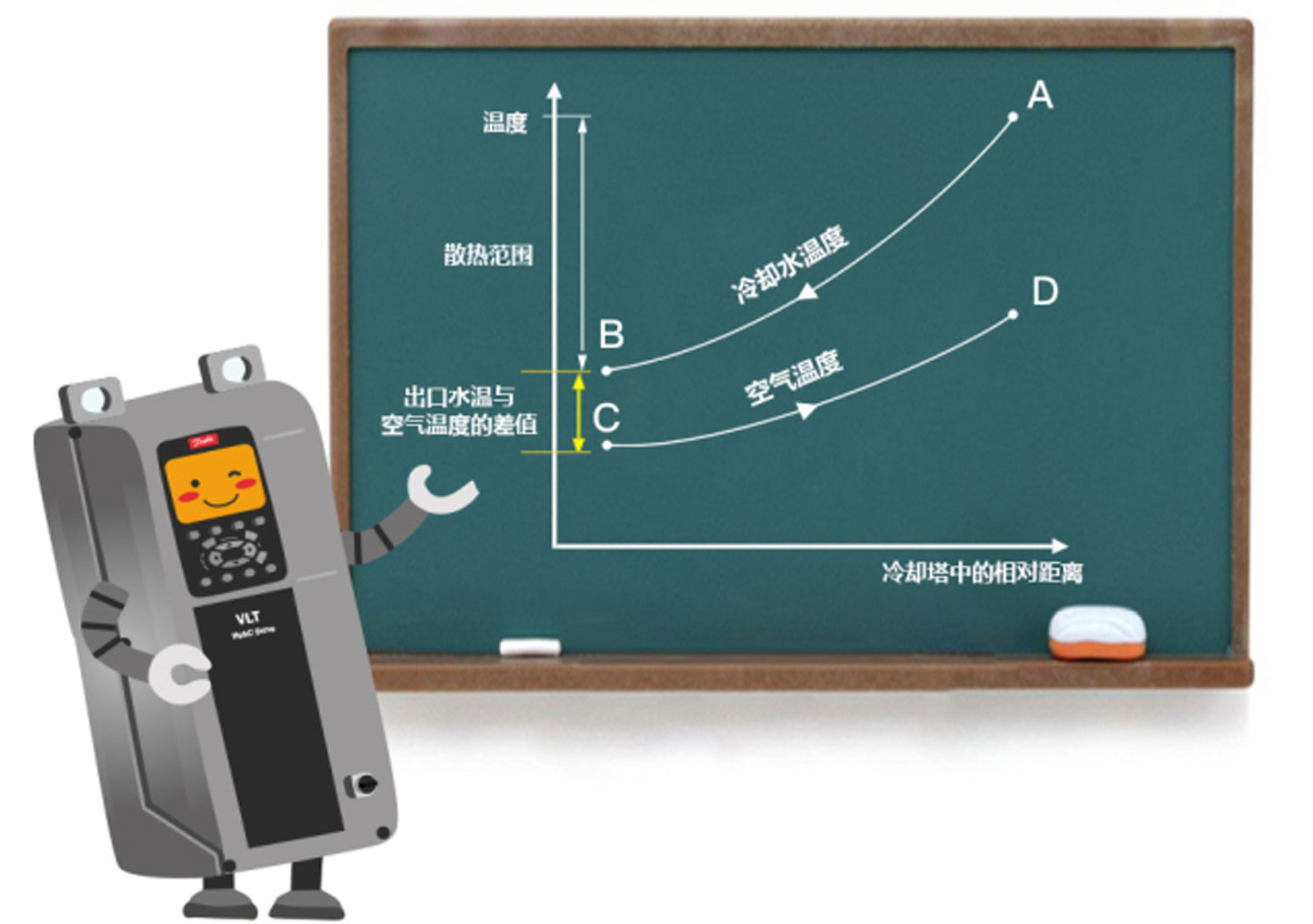 剛才提到散熱效率,那究竟該如何衡量冷卻塔散熱效果呢?教給大家一個獨(dú)家秘笈,大家快看下黑板中的曲線吧~
