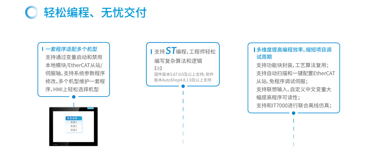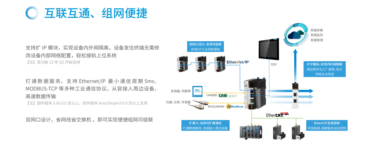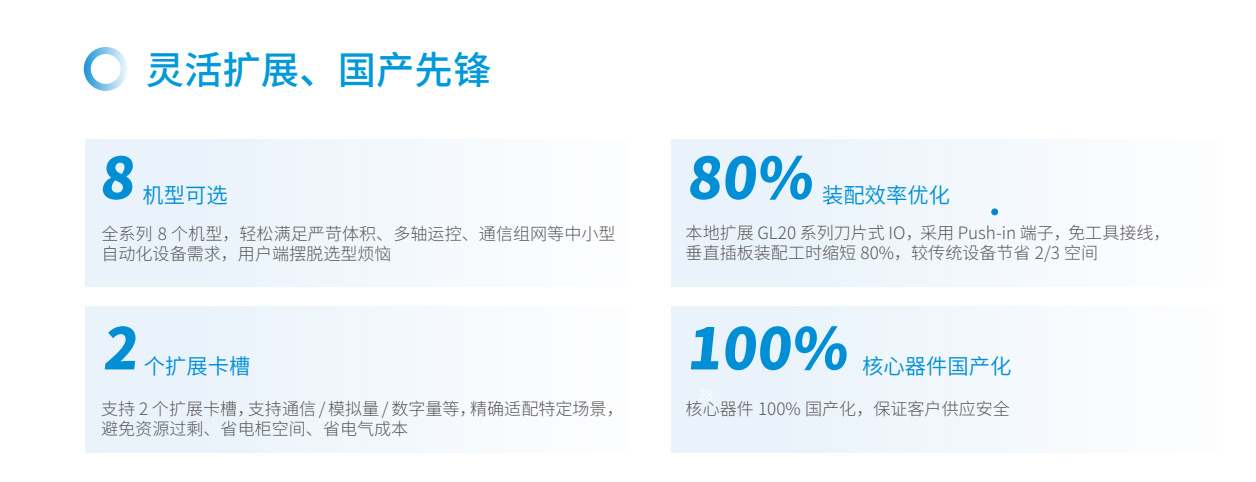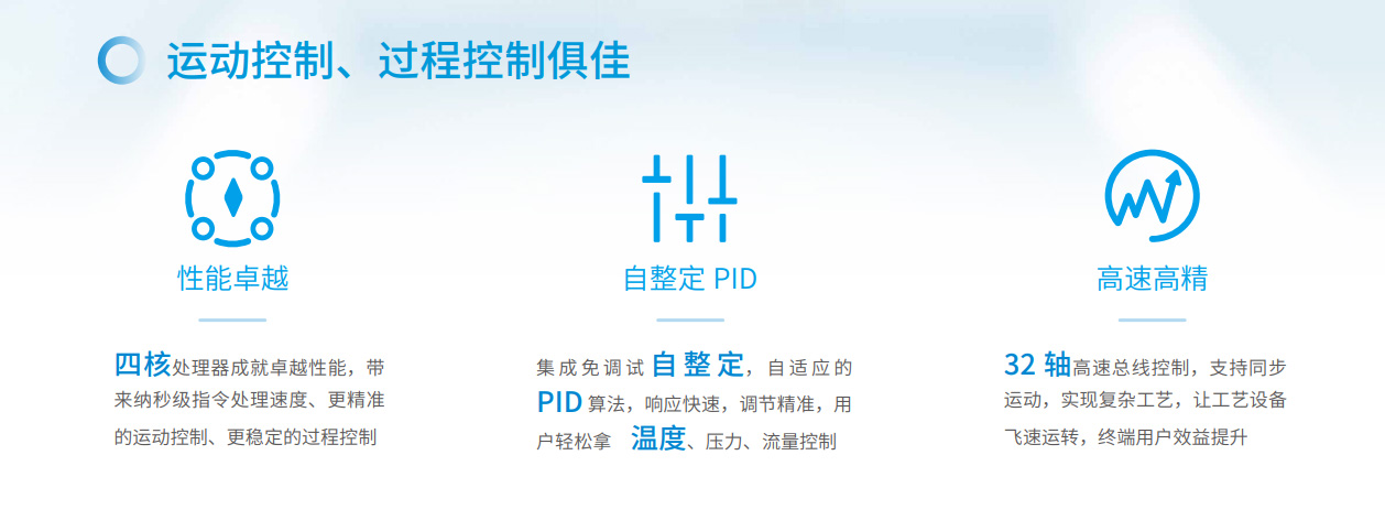 易實(shí)現(xiàn)運(yùn)動控制、過程控制易選型、易擴(kuò)展易互聯(lián)、易組網(wǎng)易編程、模塊化易交付、100%核心器件國產(chǎn)化