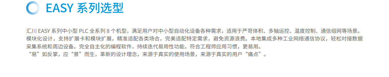 匯川EASY系列全場景緊湊型中小型控制器全系列8個機(jī)型,滿足用戶對中小型自動化設(shè)備各種需求,適用于嚴(yán)苛體積、多軸運(yùn)控、溫度控制、通信組網(wǎng)等場景。機(jī)身模塊化設(shè)計(jì),支持?jǐn)U展卡和模塊擴(kuò)展,精準(zhǔn)適配各類場合,完美適配特定需求,避免資源浪費(fèi)。本地集成多種工業(yè)網(wǎng)絡(luò)通信協(xié)議,輕松對接數(shù)據(jù)采集系統(tǒng)和周邊設(shè)備。完全自主化的編程軟件,持續(xù)迭代易用性功能,符合工程師應(yīng)用習(xí)慣,更易用。 “易”如反掌,應(yīng)“景”而生,革新的設(shè)計(jì)理念,來源于真實(shí)的使用場景,來源于真實(shí)的用戶“痛點(diǎn)”。